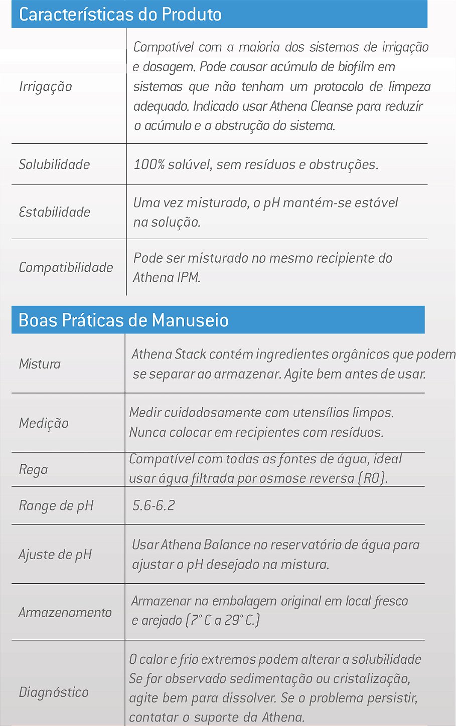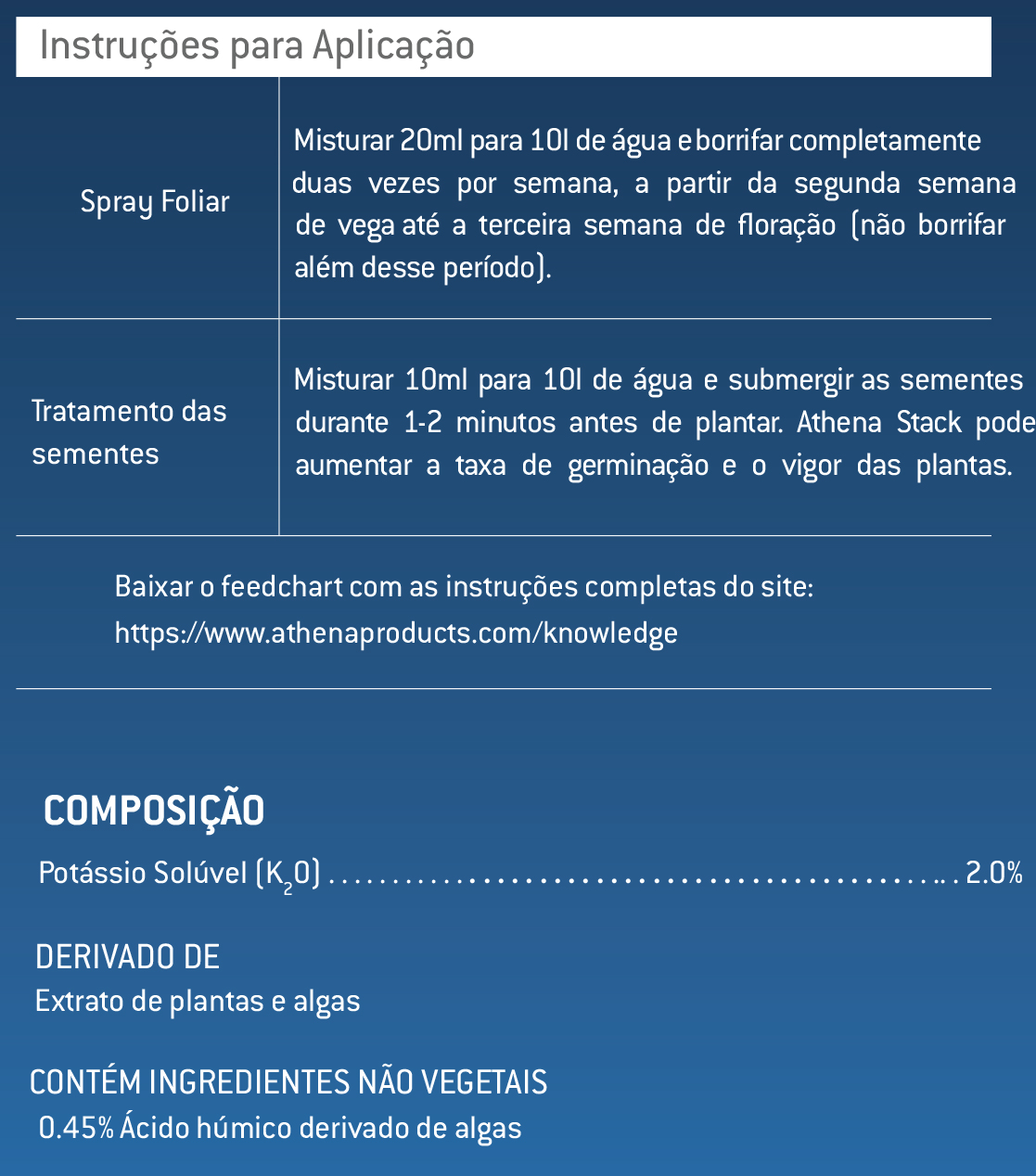 Athena Stack é um estimulante vegetal natural feito de extrato de algas e plantas. Nosso processo de extração enzimática a frio exclusivo preserva hormônios naturais das plantas, vitaminas e aminoácidos. Os metabólitos secundários de Athena Stack promovem maior ramificação lateral, nódulos mais estreitos, estabelecimento de casulo mais rápido e maior vigor durante a transição. Athena Stack fornece às plantas as ferramentas ideais para atingir todo o seu potencial. Se usado como spray foliar, os nutrientes biodisponíveis são rapidamente absorvidos pela planta. Athena Stack é um excelente aditivo e pode ser usado com outros produtos, sem que interfira nos resultados dessas substâncias.